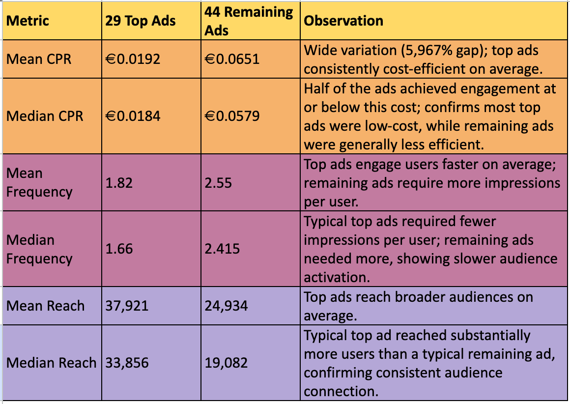- The extremely low CPR of €0.0027 shows that certain creatives achieved engagement at almost no cost, while even the upper range remains highly efficient by industry standards.
