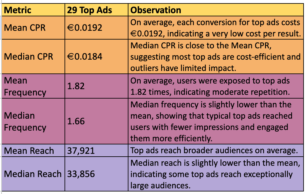 - CPR's Mean and Median Interpretation: The close alignment between the mean (€0.0192) and median (€0.0184) CPR values indicates a balanced and stable performance distribution across the top 29 ads. This suggests that cost-efficiency was consistently strong, with minimal influence from outliers, and that high ROI results were achieved broadly rather than being driven by a few exceptional ads.