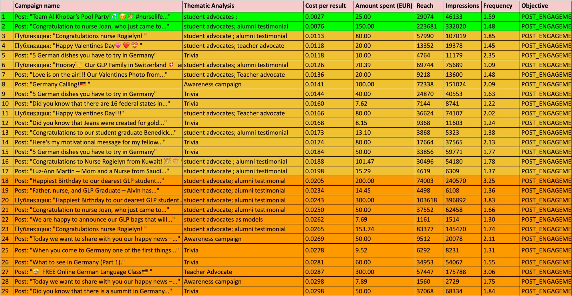 - 59% of the top-performing, most cost-efficient Facebook marketing ads featured students and teachers, while 31% focused on educational Trivia about Germany and 10% were Awareness Campaigns.